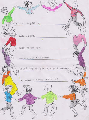 Kedua, hal ini juga bisa melatih anak-anak untuk belajar mengetahui siapa diri mereka (data diri dan keluarga mereka), sempat ada kesulitan juga, karena meski mereka sudah kelas 3 SD, eh, nama orangtua tidak tahu, alamat rumah masih bingung...apalagi tanggal lahir. Tapi menyenangkan juga belajar hal ini, anak-anak bisa belajar bersama-sama, dari hal-hal sederhana. Tambah lagi, ada ibu-ibu yang mau membantu anaknya mengisi dan mendampingi belajar. Selesai mengisi form tersebut, mereka bisa mewarnai pigura data isian mereka.